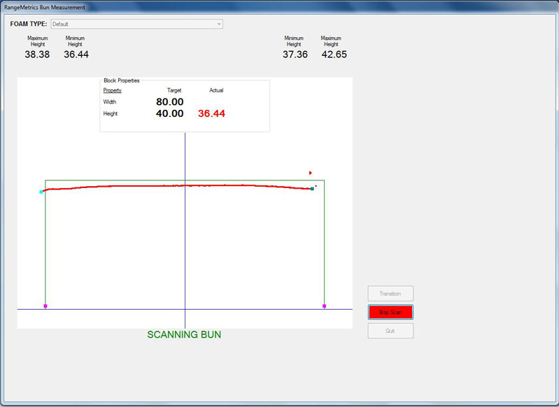 RangeMetrics' TopScanner is optimised for measuring the height of foam blocks. TopScanner is a lower cost version of the BunScanner, utilizing a single laser head mounted above the foam block.
